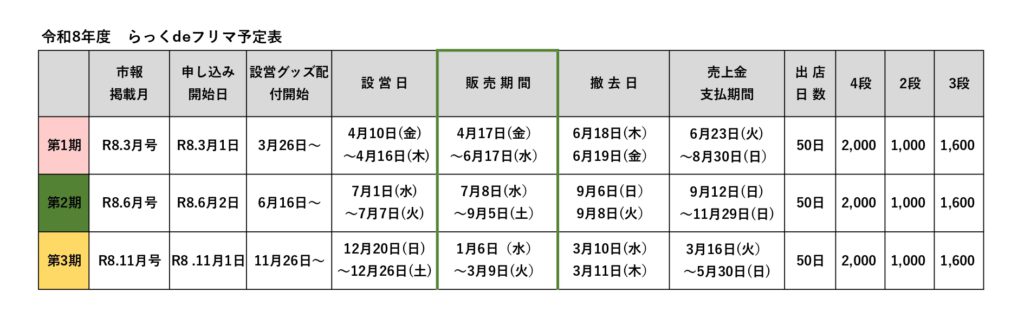 ≪らっくdeフリマ販売期間・受付開始日予定表≫
